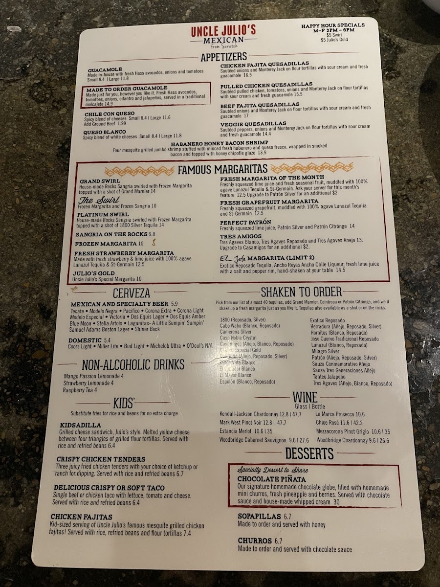 Welcome to Uncle Julio’s Fort Worth, a vibrant addition to the local dining scene located at 5301 Camp Bowie Blvd. This Texas gem caters to those craving authentic Mexican flavors and a lively atmosphere. The menu is a delightful blend of traditional favorites and innovative dishes, making each visit a culinary adventure.